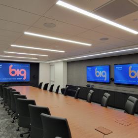 B.I.G. designed and installed the SCS and AV low voltage systems for “Project Scout” at their new Headquarters location in Reston Virginia. The project spanned multiple floors and many different types of spaces including an Innovation Sales Center, a Multi-purpose Room, a Boardroom (pictured), classified VTC suites, Unclassified VTC suites, conference rooms, huddle rooms, multiple receptions areas, and about 20 executive offices with video conferencing capabilities.